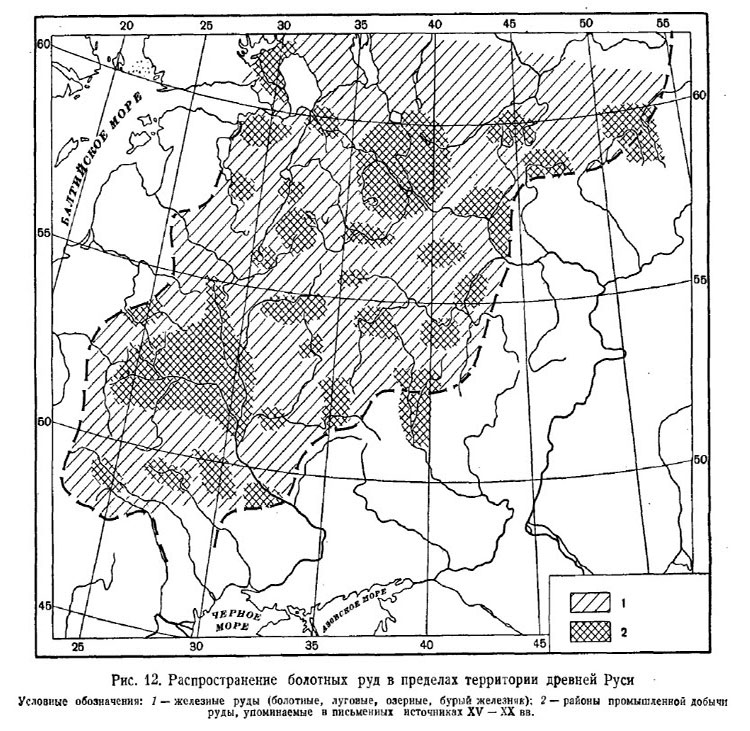 Распространение болотных руд в пределах территории древней Руси, XV–XIX. Карта Б. А. Рыбакова
